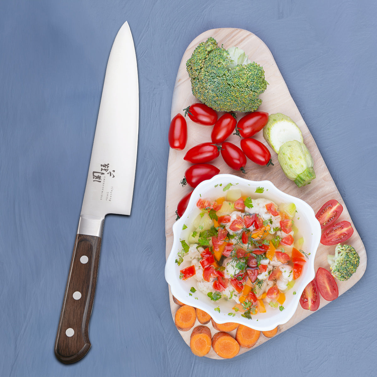 The knife features a Japanese Benifuji Chef design, which helps in obtaining linear cuts. The blade is flat and curves at the tip for a quicker cutting experience.