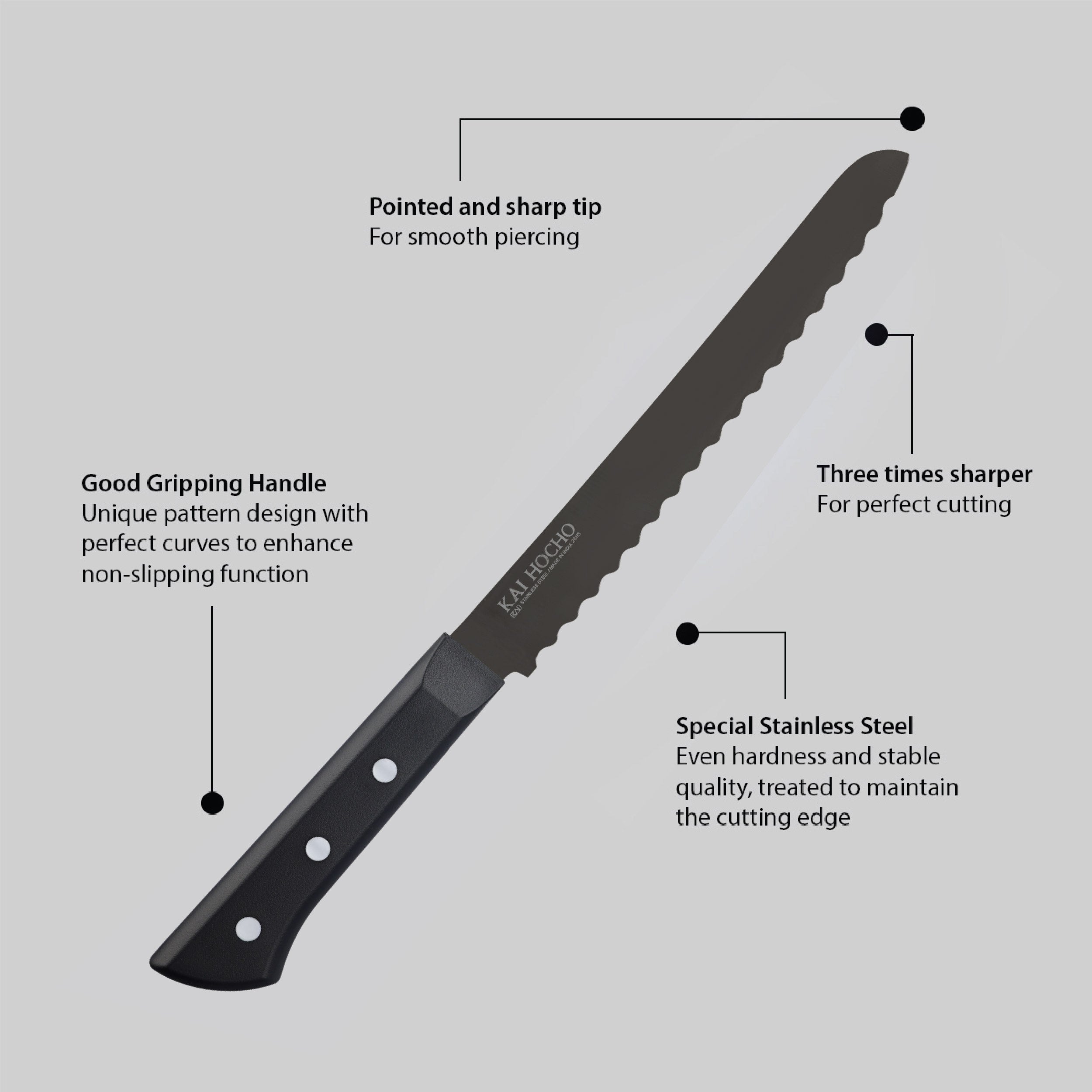 Sharp serrated edge for clean slicing through crusty and soft breads